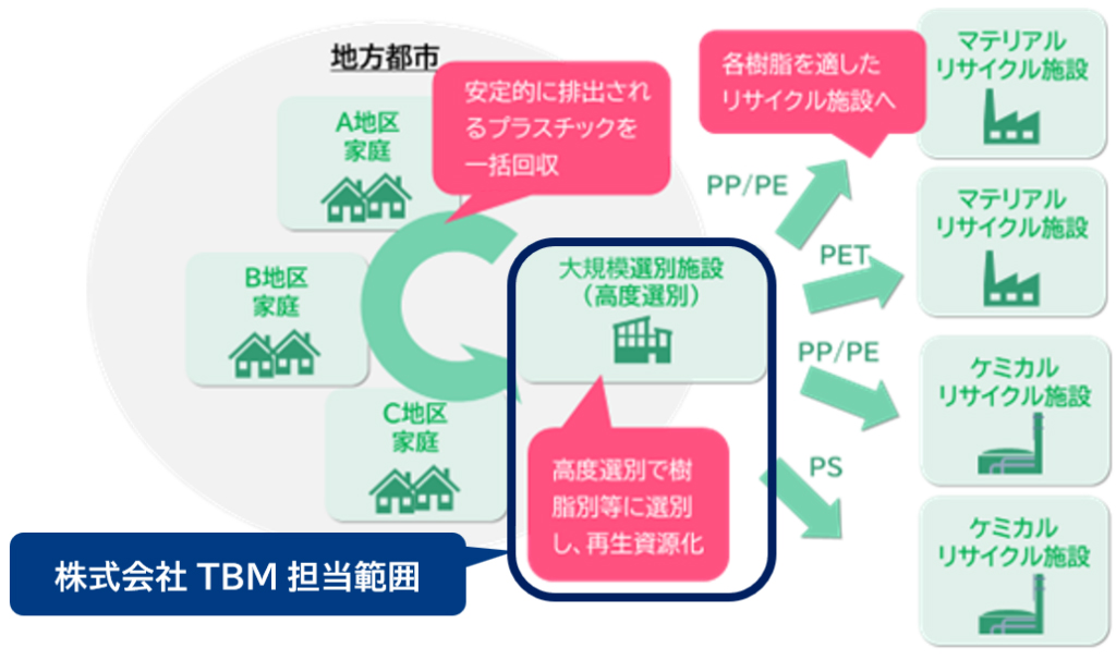 株式会社TBMは、本実証において、横須賀サーキュラー工場の選別設備を使い、茨城県内における複数の自治体による家庭由来の廃プラスチックから、PP/PE、PS、PETを高度選別し、選別された各樹脂をマテリアルリサイクル施設、ケミカルリサイクル施設へ発送する役割を担います。