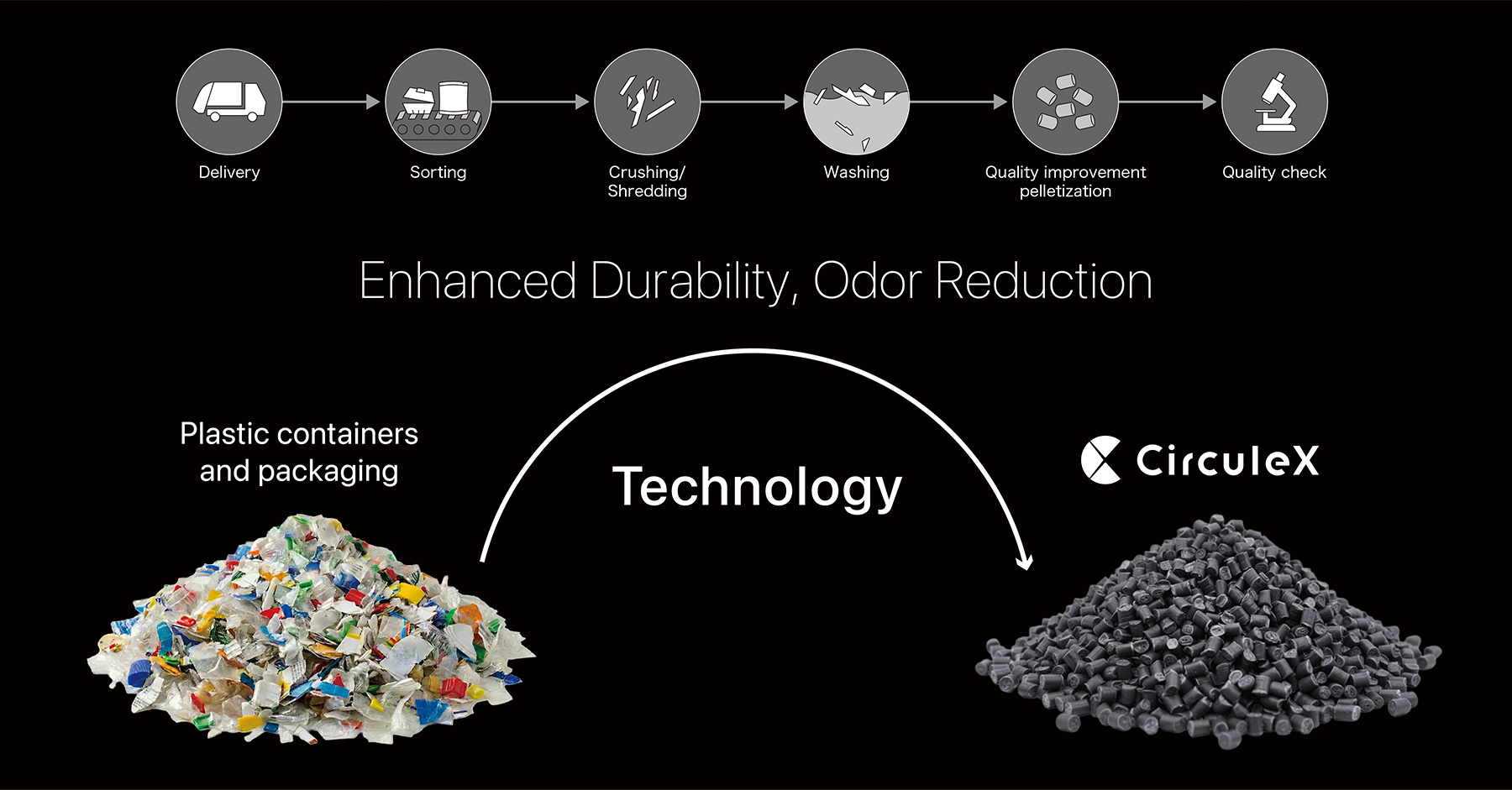 独自の配合・混錬技術で改質を図り、「CirculeX」は使用済みの容器包装プラスチック由来のPCR材でありながら、曲げ強度は、従来のPCR材と比較して約126%、バージンプラスチックと比較して約47%、耐衝撃強度は、従来のPCR材と比較して約76%、バージンプラスチックと比較して約29%、従来のPCR材やバージンプラスチックを上回る強度を実現しました*。建築資材、物流資材、自動車部品など、耐久性が求められる様々な分野での利用が可能です。